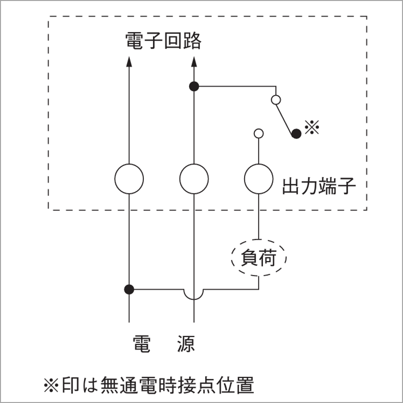 電子機器内で電源と内部結線され、出力端子には供給電源が出力されます。電子機器と負荷の電源電圧は同一となります。