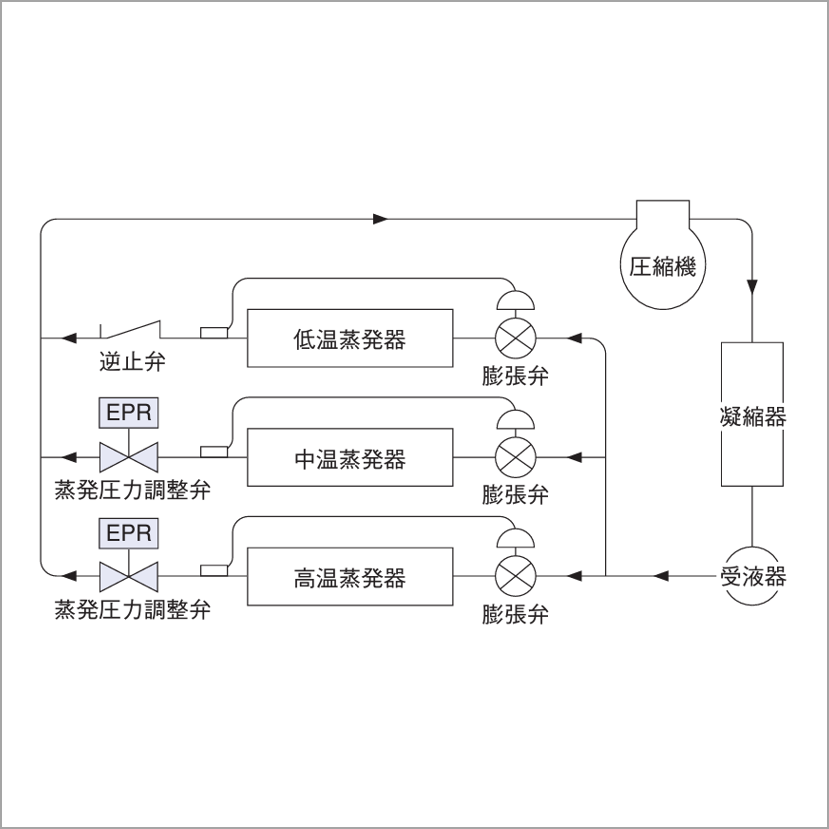 図のように、蒸発圧力の異なる複数の蒸発器を持つ冷凍システムにおいて、各々の蒸発器の圧力(温度)を制御するために、蒸発圧力調整弁が使用されます。圧縮機は蒸発圧力及び温度の最も低い蒸発器を基準にして運転されるので、その他の蒸発器の圧力及び温度が設定値より低下しないように制御します。蒸発圧力が最も低い蒸発器の直後に逆止弁を必ず取付けてください。このほか、蒸発圧力調整弁はウォーターチラーの冷水凍結防止や野菜貯蔵庫の過度の除湿防止等にも使用できます。