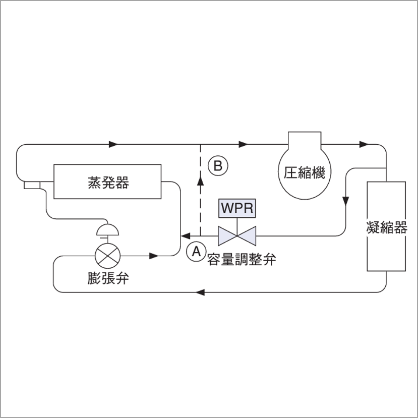 図のように、冷凍システムのバイパス回路に容量調整弁を取付けて、負荷変動に合わせて圧縮機の容量を制御するために使用できます。除湿器や空気乾燥機のドレン凍結防止等にも最適です。(バイパスラインⒶとⒷのいずれかを適宜選択ください。)このほかホットガスデフロスト回路等にも使用できます。
