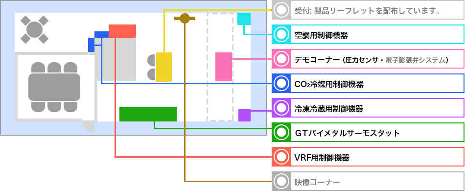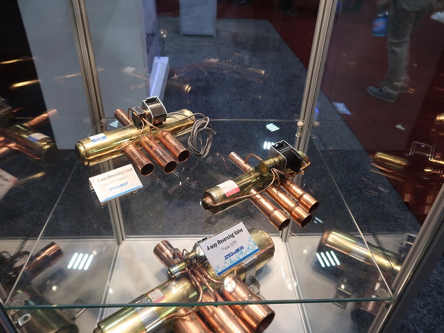 今年は“Maintaining nature, while continuing to advance in technology.”をコンセプトに掲げ、VRFの冷媒回路周り等で活躍するNSK形圧力センサ、UKV形電子膨張弁をはじめ、レジデンシャルエアコンの省コスト、省スペース化に最適なUKV-F形電子膨張弁等、先進の電子制御機器や技術を紹介しました。また、地球環境保全に貢献するCO₂など自然冷媒や低GWP冷媒等の各種代替冷媒に対応する制御機器をアピールしました。