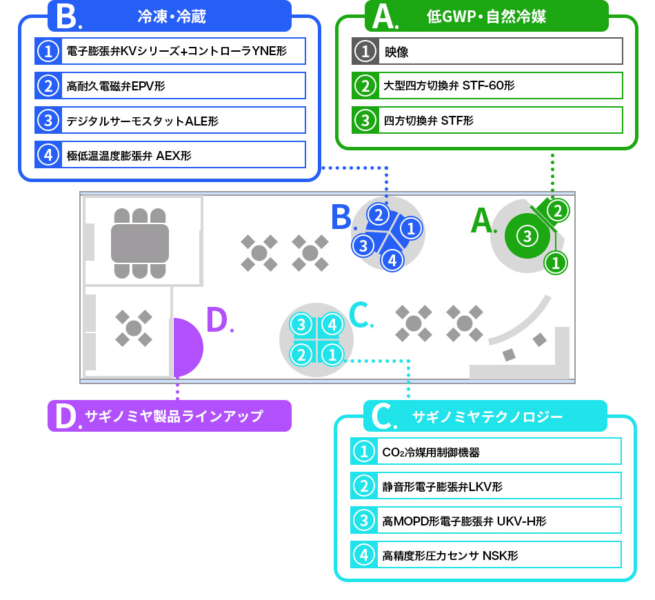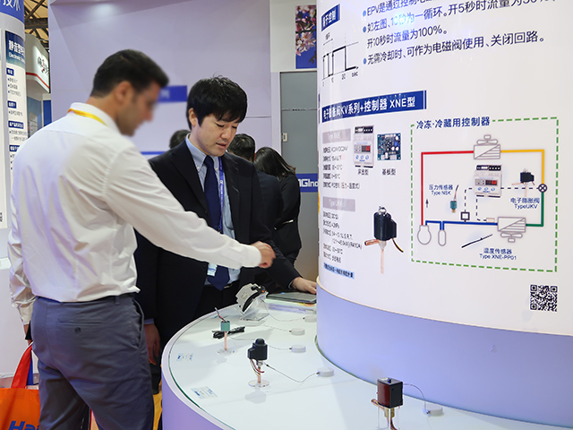 今年は「技術力の訴求」をテーマに、特長のある・競争力のある製品を紹介しました。多くの空調メーカーで実績があるUKV形電子膨張弁に改良を加え、MOPDを大きく向上させたUKV-H形や昨年リリースした様々な気候条件下でも高いパフォーマンスを発揮するNSK形圧力センサを紹介しました。また、中国国内において、ますます需要が高まっているコールドチェーン向けの冷凍、冷蔵分野で活躍する各種制御機器を多数展示しました。また、地球環境保全に貢献するCO₂など自然冷媒や低GWP冷媒等の各種代替冷媒に対応する制御機器をアピールしました。
